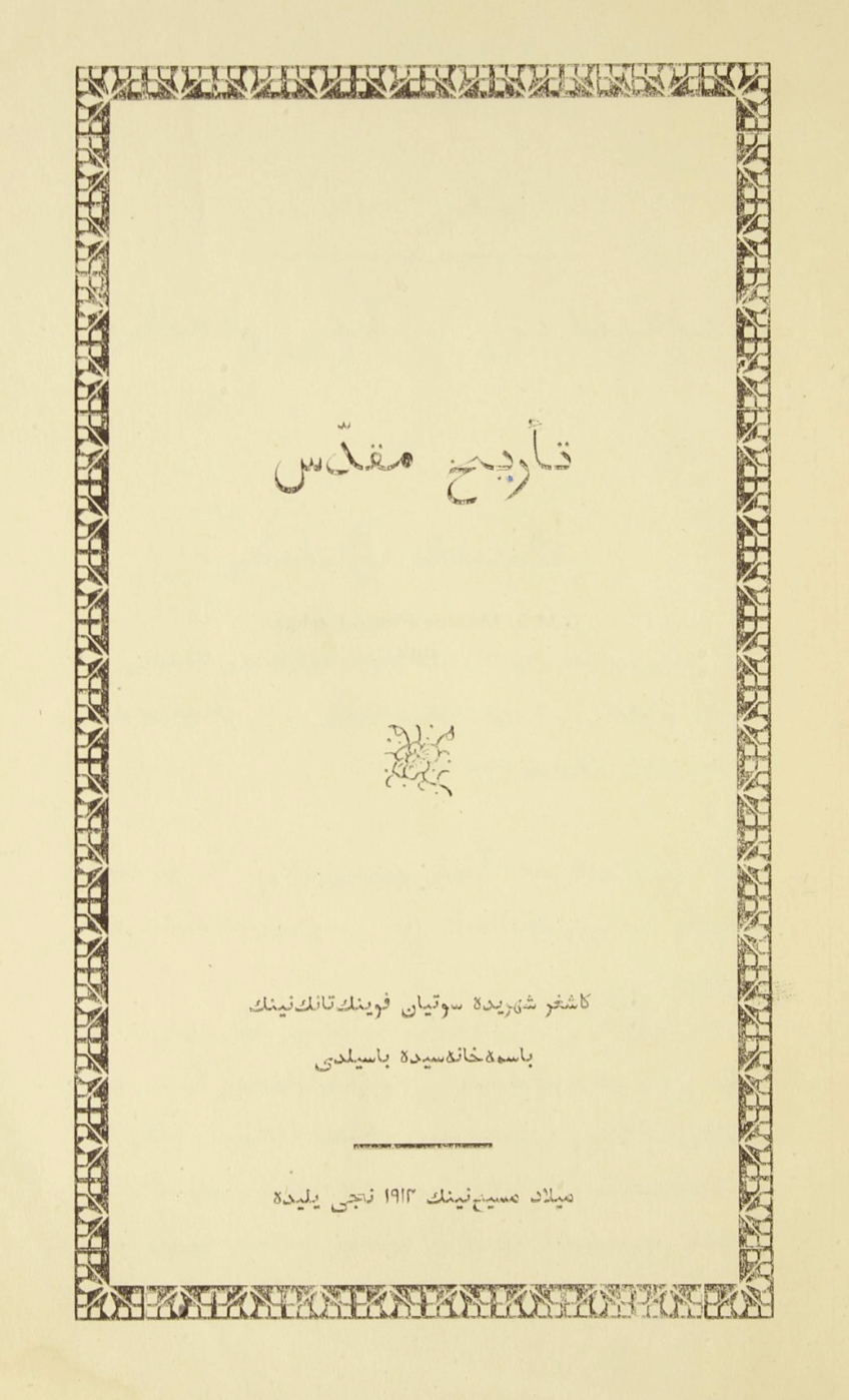 This book was translated into Eastern Turki by Magnus Bäcklund (d. in Kashgar 1903), Högberg, and Andersson. Like many other school books printed by the Swedish Mission in Kashgar, this publication was based on a Swedish original. For the Swedish original from the year 1900 see: Norlén, M. V. & Lundgren, J. F., Biblisk historia för folkskolan. Stockholm 1900.