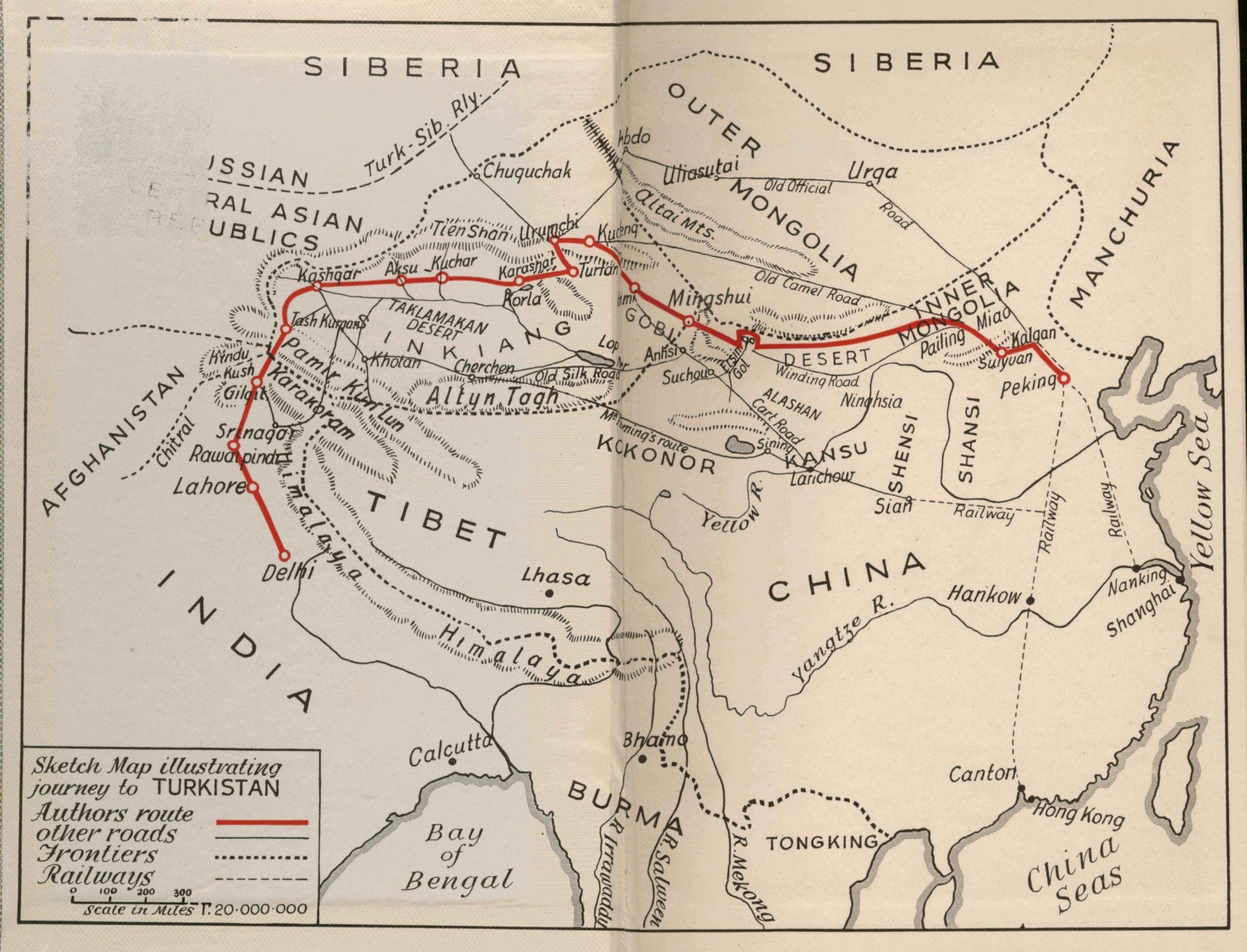 This map, which can be found in an appendix to Journey to Turkistan (1937), illustrates the British Consul Eric Teichman’s travel route from Beijing to Delhi in 1935. It is a complementary document to the author’s account of his journey back to Great Britain, through Eastern Turkestan and India after having served as the British Consul in Beijing. Teichman travels from Beijing to Suiyuan by train, after which he crosses Inner and Outer Mongolia and the Gobi desert on a motor truck to Kashgar. A second map illustrating this journey can also be found in another appendix to the same book. Teichman then travels through the Pamir and the Karakoram mountains, to Gilgit on horseback and on foot, before he takes a plane to Delhi. While encompassing most of Asia, areas around Teichman’s travel route are shown in greater detail than other areas on this pencil sketched map, where we find such cities as Turfan, Urumchi, Karashar, Aksu, Kashgar and Gilgit. Deserts are noted, as well as frontiers, railways and roads.